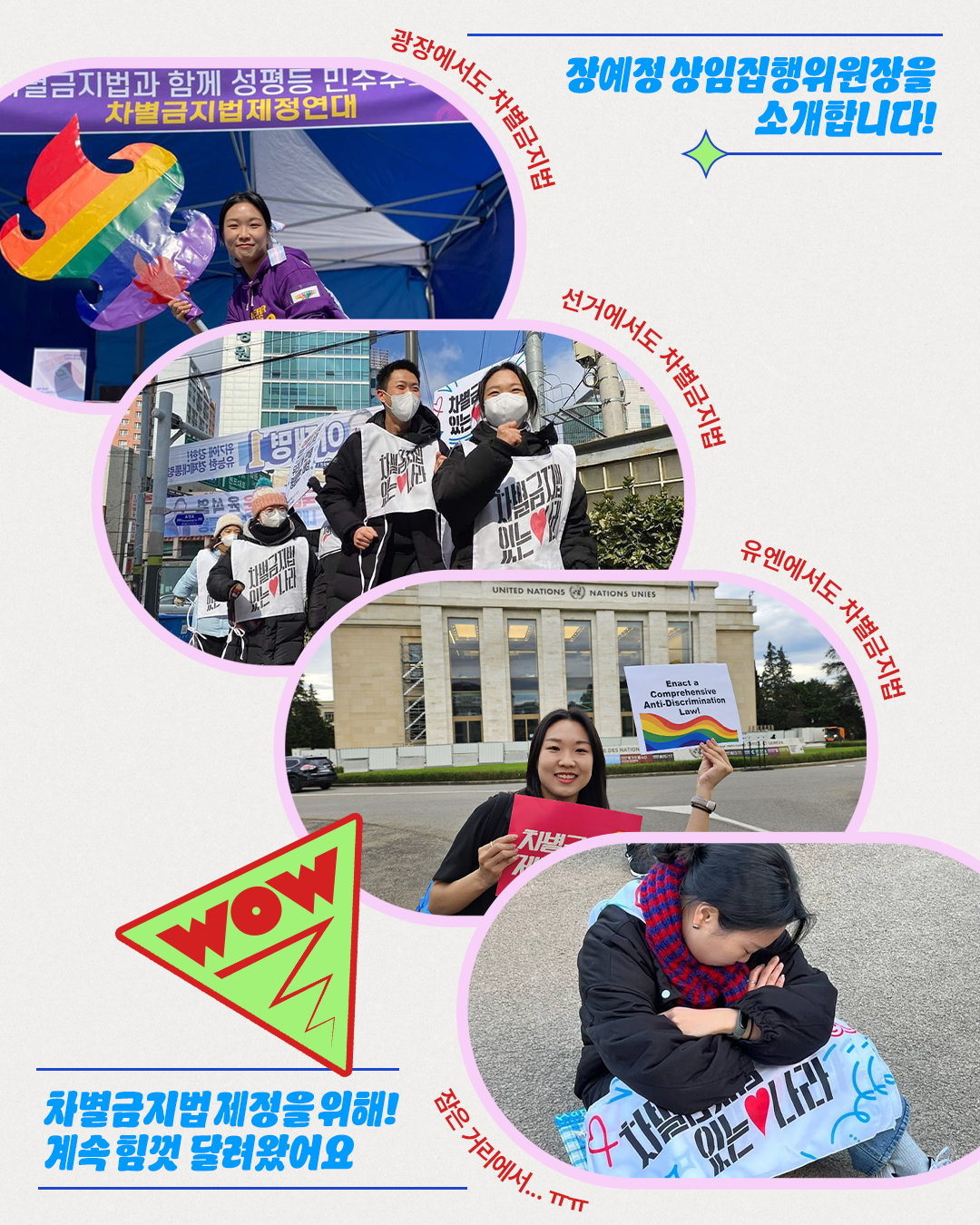 장예정 상임집행위원장은 광장에서도, 선거에서도, 유엔에서도... 2017년부터 지금까지 차별금지법 제정을 위해 계속 힘껏 달려왔어요!