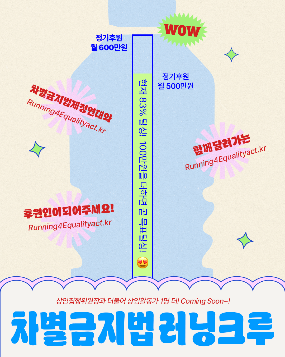 차별금지법제정연대가 안정적인 사무국 체계 위에서, 멈추지 않고 22대 국회에서 입법 투쟁을 이어가기 위해 필요한 최소 운영비, 월 600만원 목표액 중 83%인 500만원 달성! (1/30(금)까지 317명이 러닝 크루로 함께 해주셨습니다~)